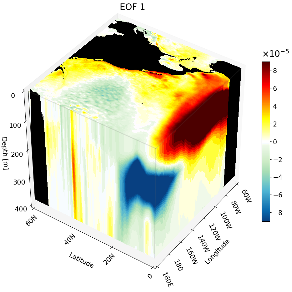 The following code is a tutorial for how to visualize 3D climate data using Matplotlib 3D projections. As an example, I use the first empirical orthogonal function (EOF) computed from the high-resolution Global Ocean Physics Reanalysis (GLORYS) output for all latitude-longitude-depth dimensions (3D) at once. The complete calculation for the GLORYS 3D EOFs can be found at this repository. The repository for the full code used in this tutorial is found at this GitHub repo.